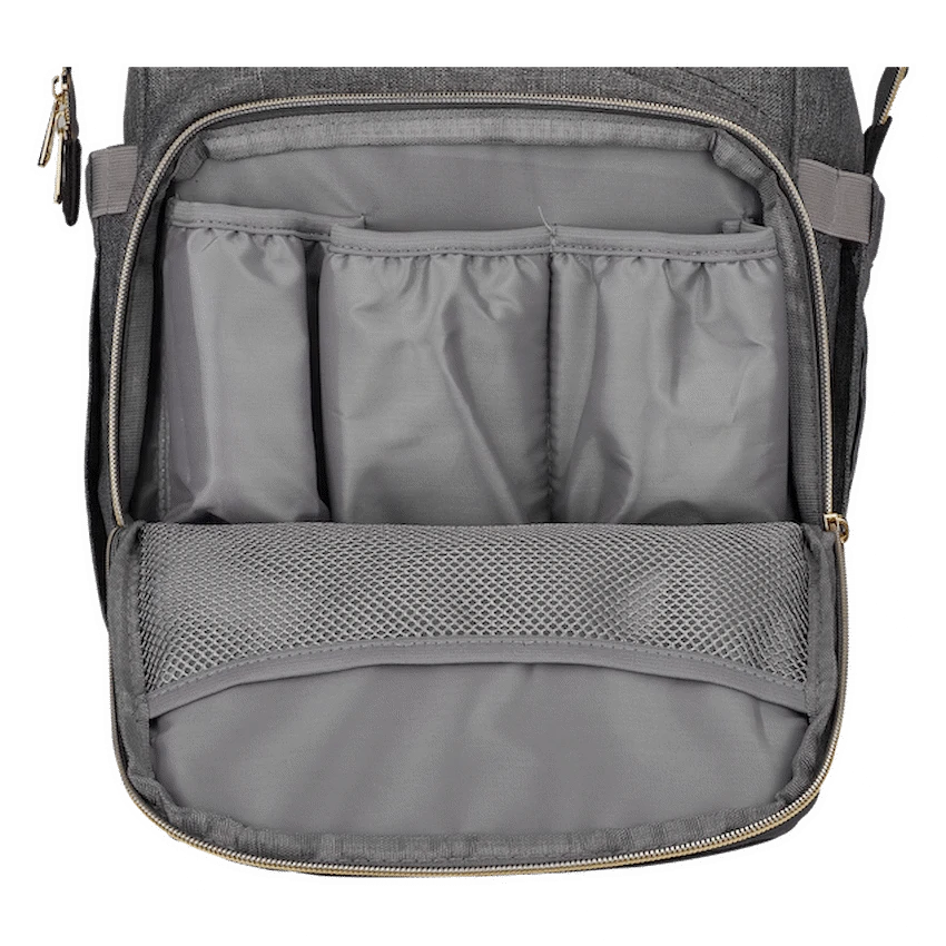 This diaper backpack is the perfect combination of high-quality construction, practical features, and fashion-forward design, making it an essential accessory for modern parents on the go. It comes with a convenient changing mat for quick diaper changes, insulated bottle pockets to keep drinks at the right temperature, and a dedicated wet wipes pocket for easy access. Stroller hooks add hands-free convenience, allowing you to attach the bag securely while out and about. Crafted from durable, premium materials, it is built to withstand daily use while maintaining a stylish, contemporary look. With thoughtfully designed compartments and a sleek silhouette, this backpack keeps all baby essentials organized, accessible, and carried in comfort and style.