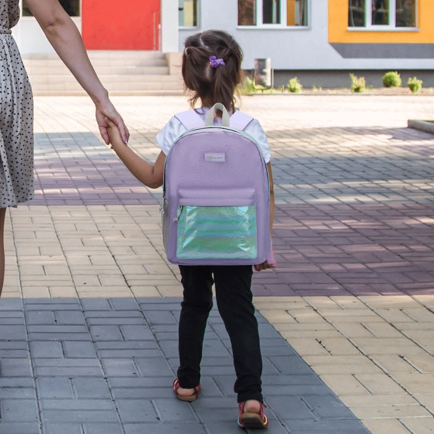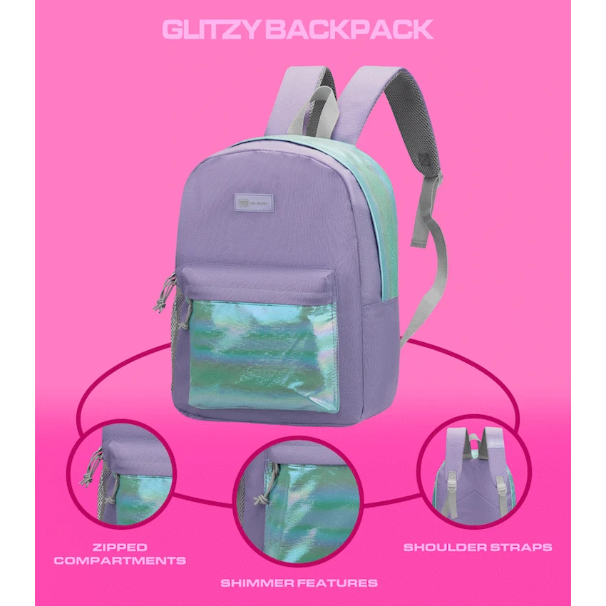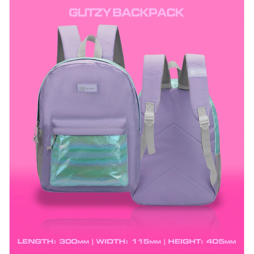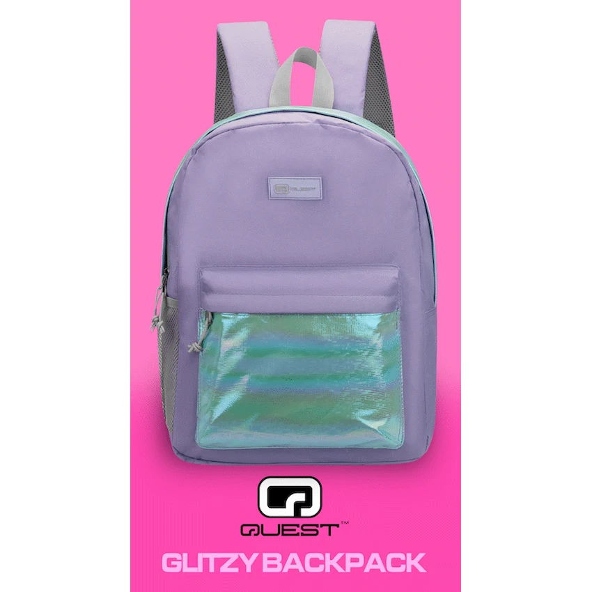Quest Glitzy Backpack Quest Glitzy Backpack is a great choice as it is lightweight, has multiple compartments for books, lunch box or even a change of clothes. It is water resistant & easy to clean. It has side pockets for water bottles as well as adjustable shoulder straps. It has a unique front shimmer pocket making it stand out!