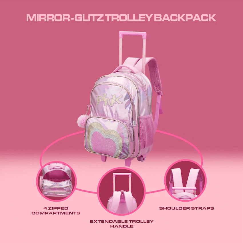 This girls’ glitzy fashion trolley backpack is every little girl’s dream bag, combining sparkle, style, and everyday practicality. Designed with a dazzling, shimmering finish, it adds a touch of glamour to school or travel while still offering all the features needed for daily use. The trolley system with smooth-rolling wheels and an extendable handle makes it easy to move around without heavy lifting, while padded shoulder straps provide the option to carry it comfortably as a backpack. A spacious main compartment holds books, clothes, or essentials, and additional pockets keep smaller items neatly organized. Made from durable materials, it is built to last while maintaining its eye-catching sparkle, making it the perfect mix of fashion and function for young girls who love to shine.