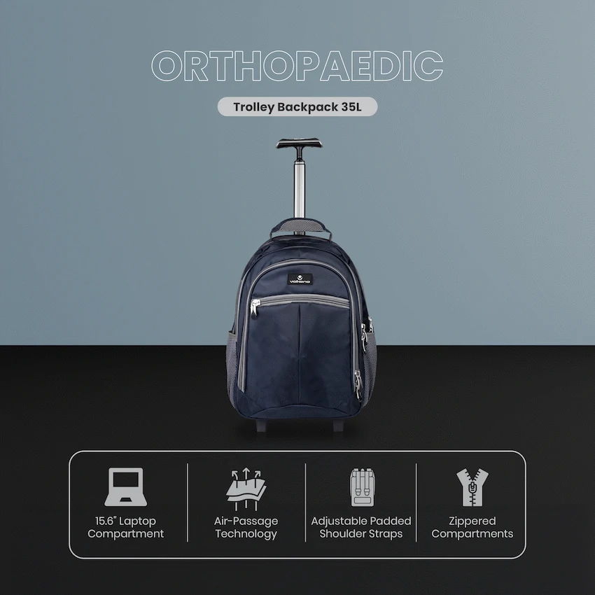 This orthopaedic, trolley backpack offers the convenience of two bags in one, combining the easy mobility of a trolley case with the versatility of a backpack. Equipped with smooth-rolling wheels and a sturdy extendable handle, it glides effortlessly through airports, stations, or city streets, reducing strain during travel. When needed, padded shoulder straps allow it to be worn comfortably as a backpack, providing flexibility for different situations. The spacious main compartment and multiple pockets ensure organized storage for books, laptops, clothes, or daily essentials, making it ideal for students, professionals, or travellers. Crafted from durable, high-quality materials with reinforced stitching, this trolley backpack is designed to be strong, practical, and reliable for everyday use or longer trips.
