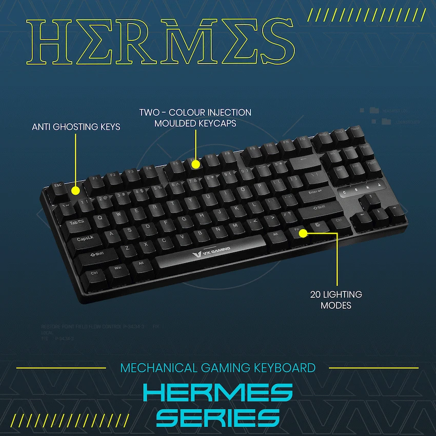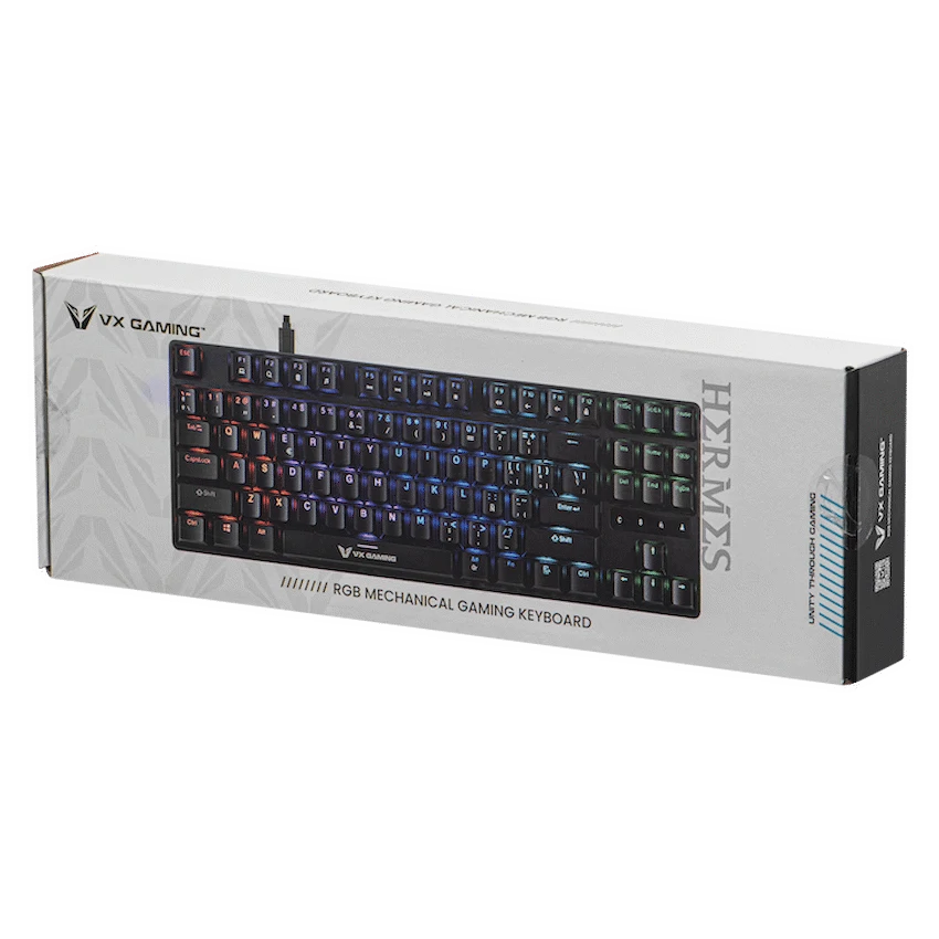 Take your game to the next level with the VX Gaming Hermes Series Mechanical Keyboard (VX‑211‑BK). Built for speed and reliability, this keyboard features responsive Red mechanical switches, an 87‑key compact layout that frees up desk space, and 20 lighting modes with RGB effects to match your setup or mood.