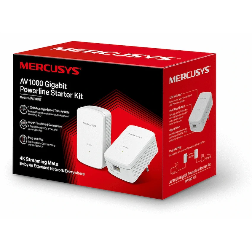 The Mercusys MP500 KIT transforms your existing electrical wiring into a high-speed data network—no drilling or new cables required. With HomePlug AV2 technology, it supports up to 1000 Mbps transmission speed, enabling stable wired connections for streaming, gaming, and large file transfers.