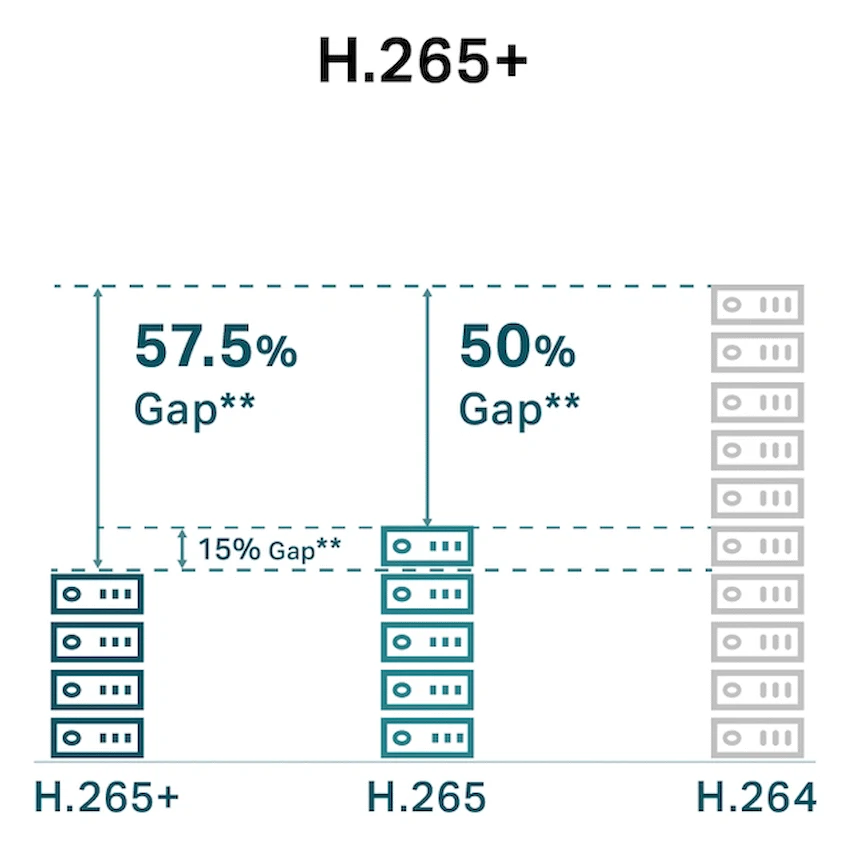 H.265+△: Compresses the video size without sacrificing video quality, easing the network load and saving disk space.