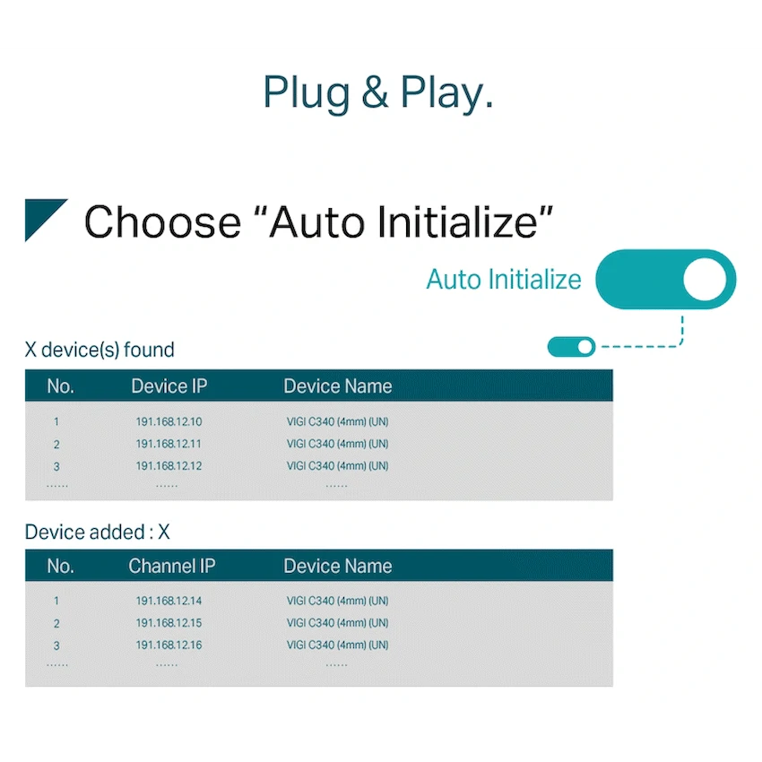 Plug & Play: Allows new and unused VIGI IP Cameras to be added automatically to the new NVR and activated instantly, making installation faster than ever before.