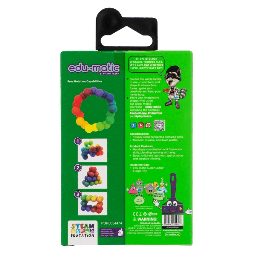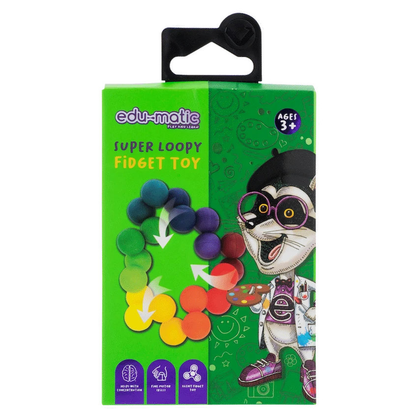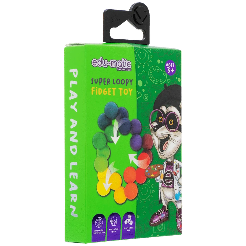 The Super Loopy Fidget Toy is a fun, engaging, and stress-relieving accessory designed for both kids and adults. Made up of twenty brightly coloured connected balls, it can be twisted, looped, and shaped into endless patterns, stimulating creativity and focus. Its silent design makes it ideal for use at school, in the office, or while travelling, allowing discreet fidgeting without disturbing others. Perfect for relieving stress, improving concentration, or simply keeping hands busy, this fidget toy is lightweight, durable, and easy to carry anywhere. Whether used as a calming tool, a boredom-buster, or a playful desk accessory, the Super Loopy Fidget Toy is a simple yet effective way to promote relaxation and focus throughout the day.